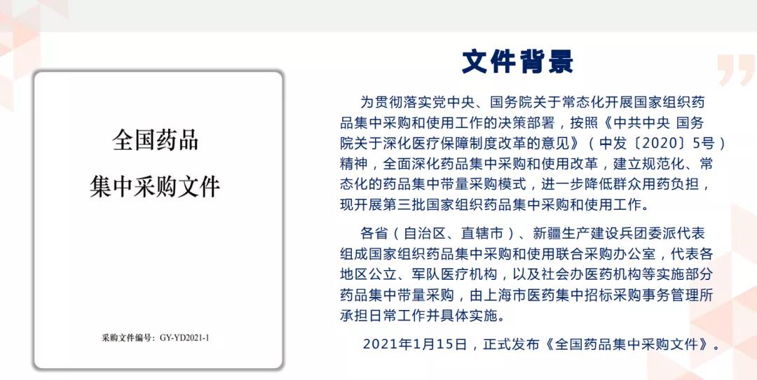 今日(1月25日),國家聯(lián)采辦再次發(fā)文,為做好集采解讀工作,企業(yè)可登陸“國家組織藥品集中采購綜合服務平臺”,下載《全國藥品集中采購文件要點解讀》進行學習。網(wǎng)址為:http://pub.smpaa.cn/xxsj。